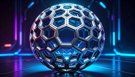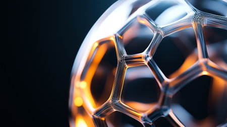 The soccer ball is highlighted with glowing edges, emphasizing its unique geometric patterns and surface texture.