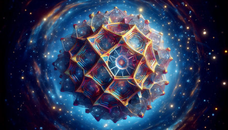 An abstract, geometric sphere composed of interconnected cells, illuminated from within by vibrant cyan and magenta light, with floating particles creating a sense of depth and wonder.