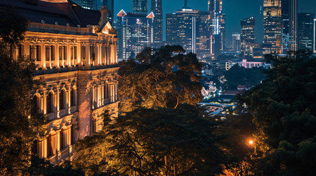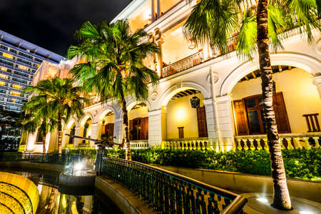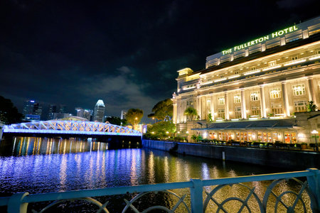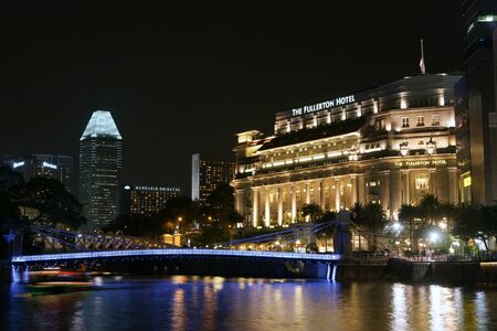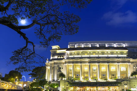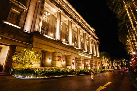 SINGAPORE - CIRCA APRIL, 2019: view of the Fullerton Hotel in Singapore at night.