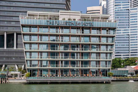 Singapore - March 21, 2019: On Marina waters. The Fullerton Bay Hotel expansion above the water has glass walls. Green foliage on the sides, walls of skyscrapers in back.