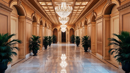Elegant hallway with marble floor, wooden walls, potted plants, and crystal chandeliers illuminating the space. AI generated image