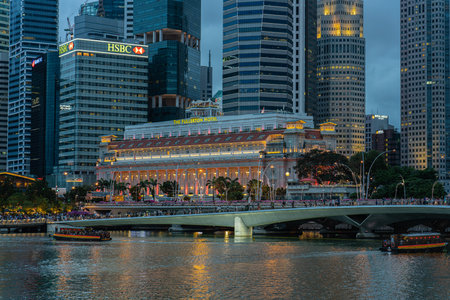 Singapore, Singapore - Feb 24, 2018: Blue hour view of The Fullerton Hotel with tourboats in the water