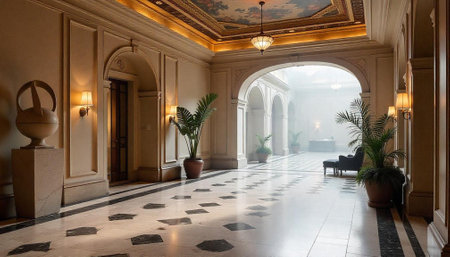 Opulent lobby of a five-star hotel featuring intricate ceiling details, gold accents, and polished stone floors