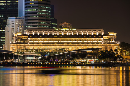 Singapore, Singapore - February 29, 2016: Fullerton hotel building at Marina Bay in Singapore at night. It is illuminated with light and reflected in the water.