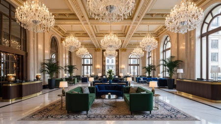 This photograph depicts a spacious hotel lobby, featuring ornate chandeliers and symmetrical arrangements of seating. The scene is illuminated by warm lighting, highlighting the rich textures of the furniture and architectural details. The overall composition suggests a sense of luxury and sophistication, suitable for various commercial and editorial applications.