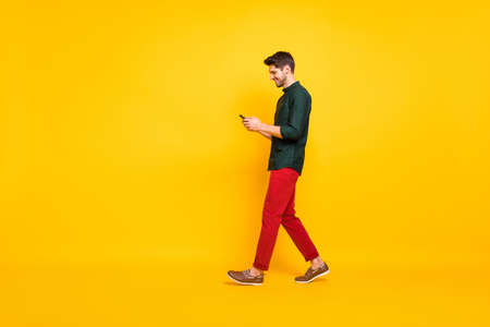 Full length body size photo of moving cheerful walking addicted attractive man browsing through his telephone wearing red pants trousers footwear isolated over yellow vivid color background