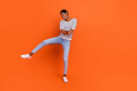 Photo of funky pretty butch lady dressed sweater rising dancing smiling isolated orange color background