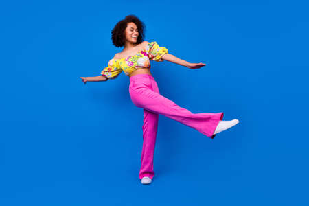 Full length photo of gorgeous crazy girl enjoy clubbing dance spend pastime isolated on blue color background