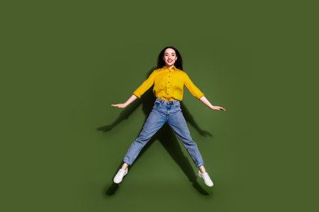 Full body photo of cute millennial lady jump wear t-shirt jeans shoes isolated on yellow background
