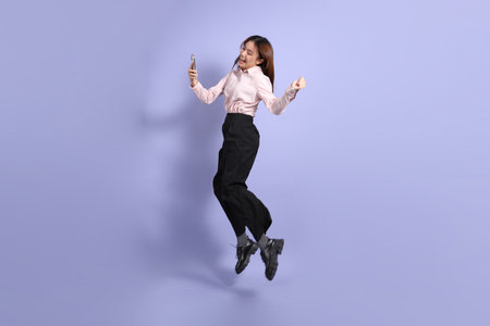 A young Southeast Asian woman in business clothes, standing against a purple background.