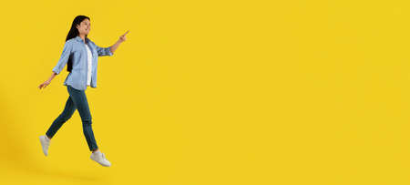 Cheerful happy millennial asian woman go, frozen in air and pointing finger at empty space