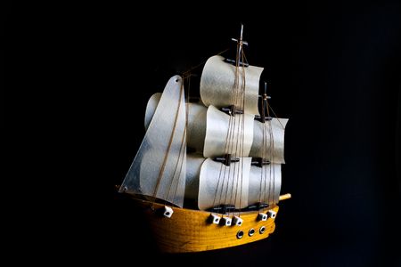 Wooden ship toy model, isolated on black background