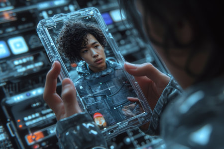 ransparent smartphone display on with AI text to the screen for futuristic technology concepts.