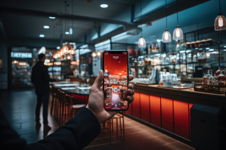 A person holds a smartphone showing sound visualization graphics in a stylish cafe during the day.
