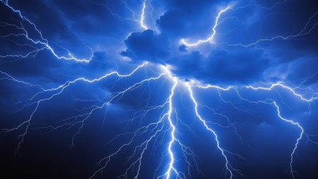 Vivid blue lightning bolts crackle and flash across dark, ominous storm clouds, creating a dramatic and powerful natural display.