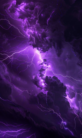 A breathtaking display of lightning illuminated against a deep purple and blue sky. This powerful natural phenomenon showcases dynamic energy and dramatic weather.