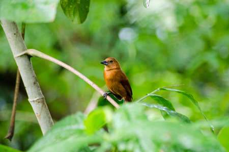 A female white-lined tanager perched on a tree branch in the rainforest of Tobago, Trinidad and Tobago in the Caribbean.