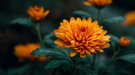 Radiant Orange Chrysanthemum Bloom in a Moody Garden Setting