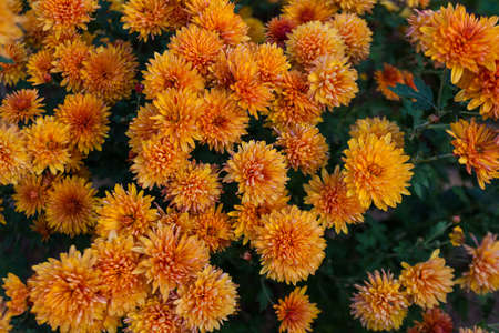 Beautiful orange chrysanthemums in green leaves. Bush of autumn chrysanthemums. Garden plants, growing flowers.