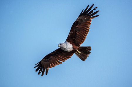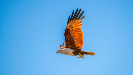 Brahminy Kite flies across the sky, clutching a fish in its talons. Skilled hunter against a clear blue sky background.