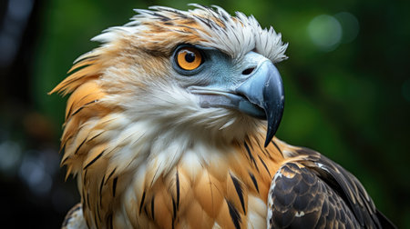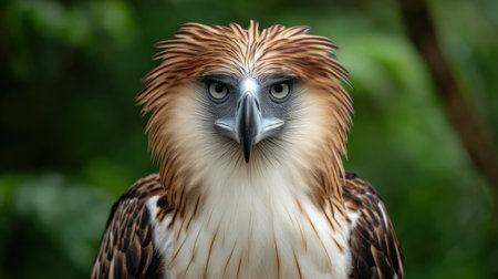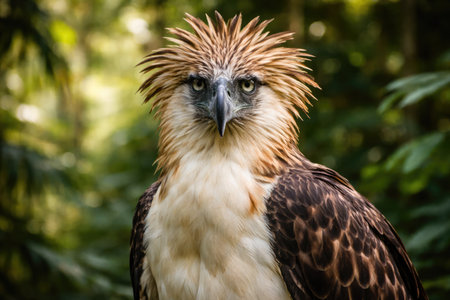 A Philippine eagle (Pithecophaga jefferyi) perched on a tree in the dense forests of Mindanao, its magnificent crest and piercing eyes a proud image of national heritage.