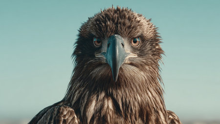 A striking close-up showcases a powerful eagle, its intense gaze focused directly forward. The image highlights textured brown feathers and a prominent blue beak against a soft, blurred background. The composition suggests an outdoor environment with natural lighting, ideal for wildlife imagery, print media, or editorial content.