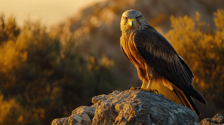 A close-up of a Black Kite perched on a rock, its piercing yellow eyes focused and alert under the golden light of Monfrag