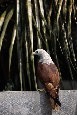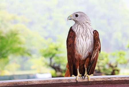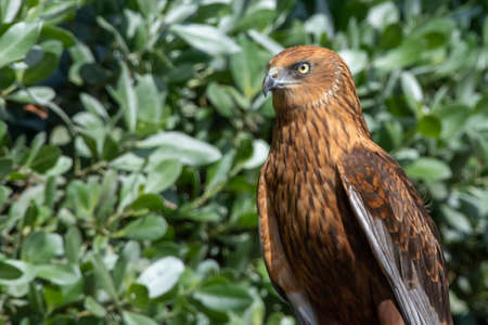 Closeup of a Beautiful Brahminy Kite or Red-backed Sea Eagle, a red hawk found along coastal areas and mangrove forest in Thailand