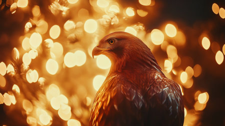 Detailed shot of a majestic bird with bright feathers, sitting gracefully against a backdrop of glowing, softly diffused lights, adding a dreamy quality to the scene.
