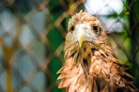 Brown Eagle in a Cage. Walk through the National Park. Summer Day, Zoo Animals, Close Up Eagle Head