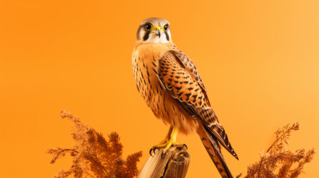 a falcon perches on a wooden stick during sunset, creating a captivating scene with its dark orange and light amber hues. the image showcases a bold saturation innovator, reminiscent of museum gallery dioramas. softbox lighting enhances the details, reminiscent of the works of charles spencelayh. the falcon stands out against the matte yellow background, adding depth to the composition. ai generated