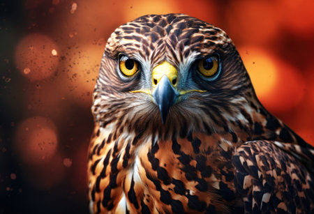A striking close-up of a falcon, showcasing its intricate details and vibrant colors. This image captures the essence of wildlife and natural beauty.