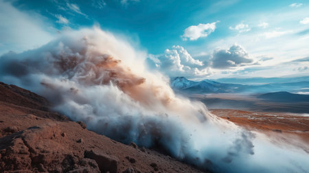 Dramatic volcanic eruption with billowing clouds of steam and smoke