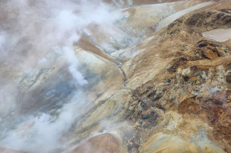 Steaming, sulfuric, active fumaroles near Mutnovsky volcano, Kamchatka Peninsula, Russia