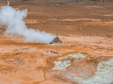 Landscape with eruption steam. Geothermal area Namafjall, Iceland, Europe. Overcast day