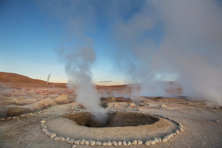 Fantastic Southamerican landscapes.Deserts,volcanoes,geysers. Geyser Sol de Manana, Bolivia.