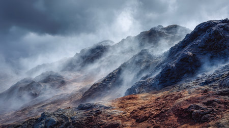 Enveloped in soft fog, rugged peaks rise beneath swirling, heavy clouds, evoking a sense of mystery and awesome in this majestic highland scene.