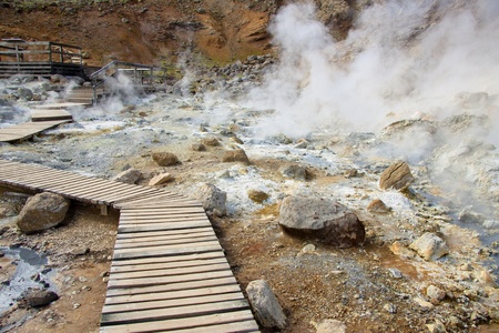 Wooden path in geothermal area in Iceland. Summer day.