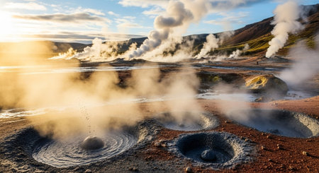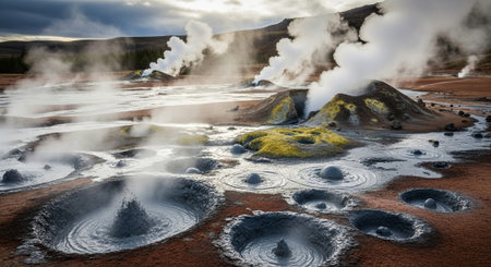 Icelandic landscape with fumaroles and geysers.
