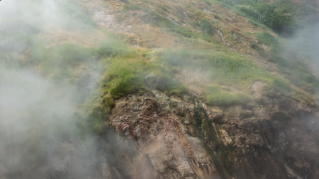 The mountain slope is hidden in a dense steam from hot springs. There is green vegetation on the rocky soil. Valley of Geysers. Kamchatka.