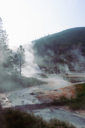 A vertical shot of the geysers in Yellowstone National Park, United States.