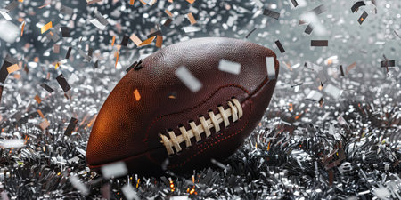 Rugby ball on tinsel with confetti. 3d illustration