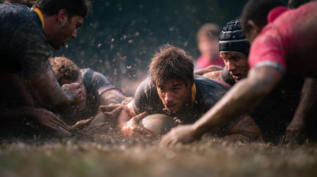 Rugby scrum powerful force determined expressions natural pitch colors controlled intensity physicality of rugby