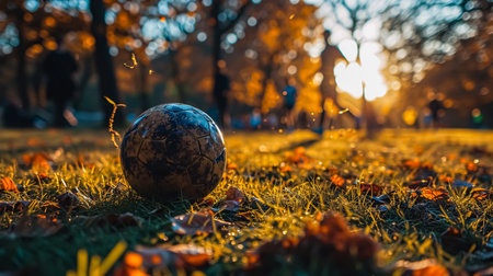 A soccer ball sits on the green grass of a park, surrounded by fallen autumn leaves. The sun sets in the background, casting a warm glow over the scene.