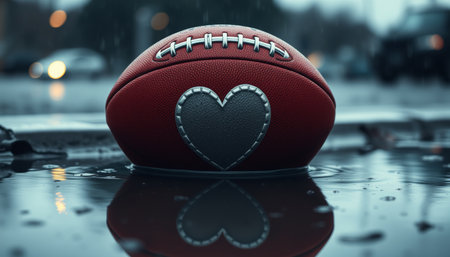 Valentine Football in Rain. A football with a heart sits in a puddle on a rainy evening, reflecting city lights.