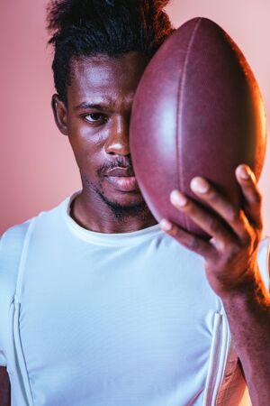 serious african american sportsman looking at camera while holding rugby ball on pink background with lighting