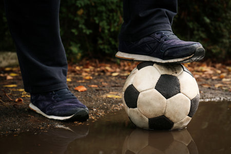 Man with soccer ball in muddy puddle outdoors, closeup