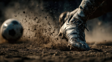 A close-up of a soccer player's cleats kicking up dirt as they strike a ball towards the goal in dramatic slow motion.