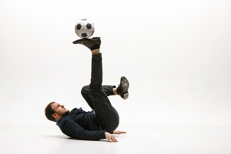 Businessman with football ball in office. Soccer freestyle. Concept of balance and agility in business. Manager perfoming tricks isolated on white studio background.