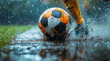 A player kicks a wet soccer ball through puddles during a rain-soaked match on a muddy field in the afternoon. Generative AI